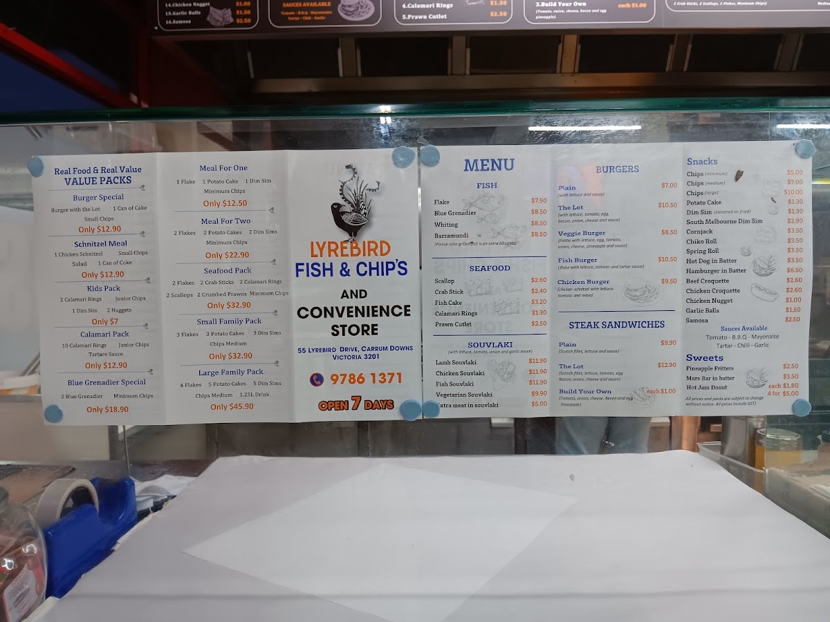 The menu at Lyrebird Fish N Chips And Convenience Store is a treat for anyone who loves classic, crispy fish and chips. With an array of seafood options cooked to perfection, you'll enjoy a satisfying, hearty meal every time. Their fish is always fresh, and each dish comes with the perfect golden, crispy batter that is the hallmark of great fish and chips. If you're in the mood for something different, there are also other fried snacks and convenience store items, making it easy to grab a quick snack or meal on the go.